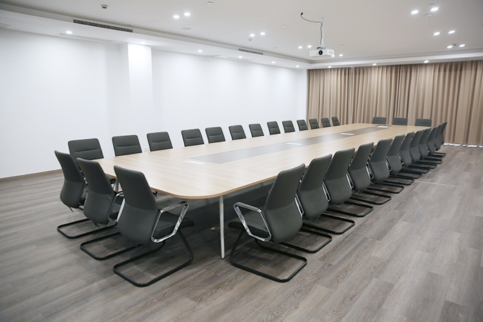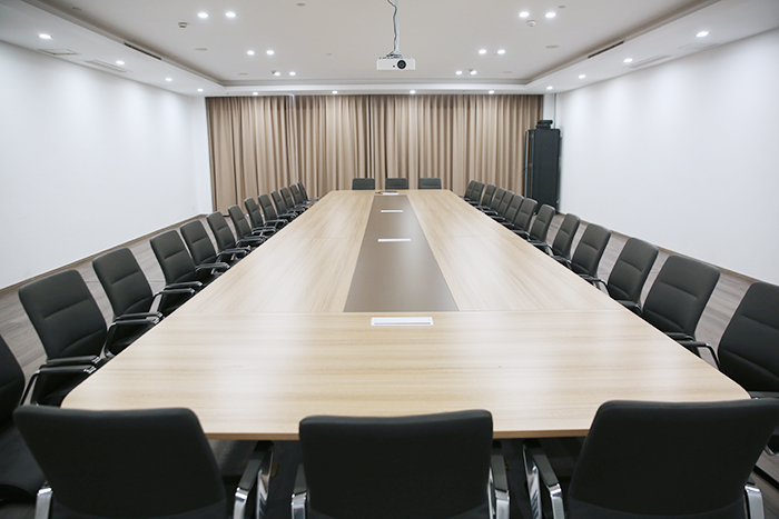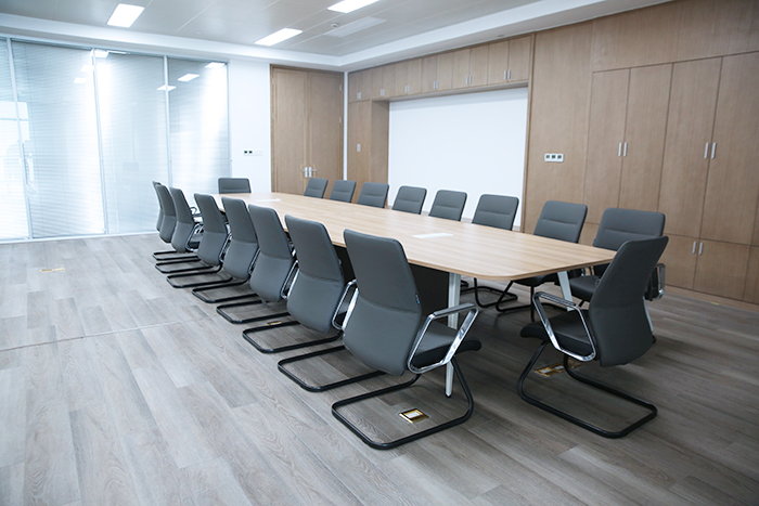 會議桌根據會議室的大小(xiǎo),選擇了相應長(cháng)度的會議桌,并搭配了灰色系的皮質(zhì)會議椅;